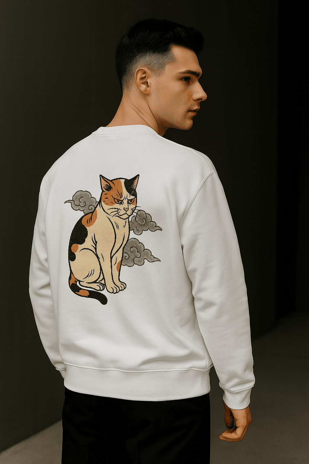 浮世絵から抜け出したような、独特の存在感を放つ三毛猫アートスウェット。