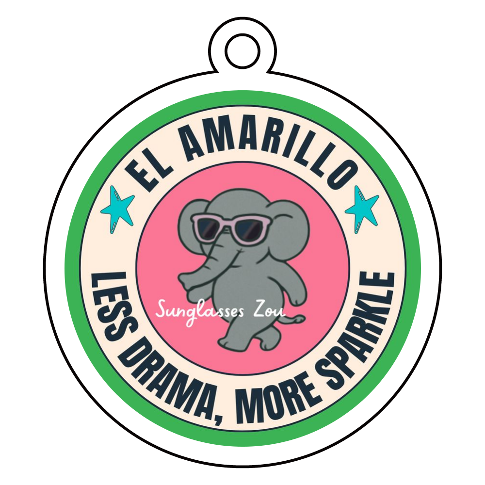 丸いフォルムが可愛い円形キーホルダーに、レトロポップなサングラスゾウをデザイン。