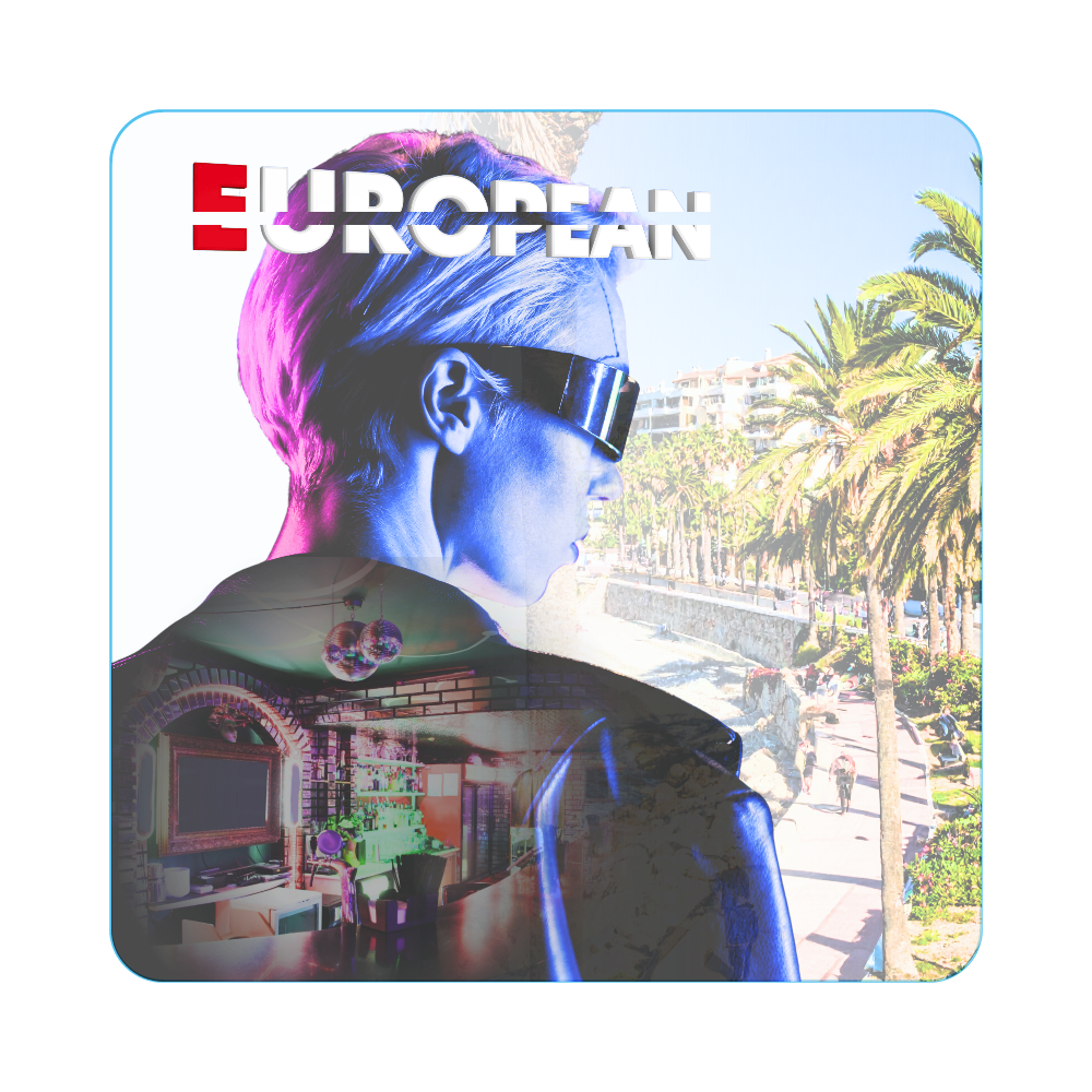 サングラスを着用したカッコイイヨーロッパの女性とヨーロッパの風景をコラージュしたデザインです。