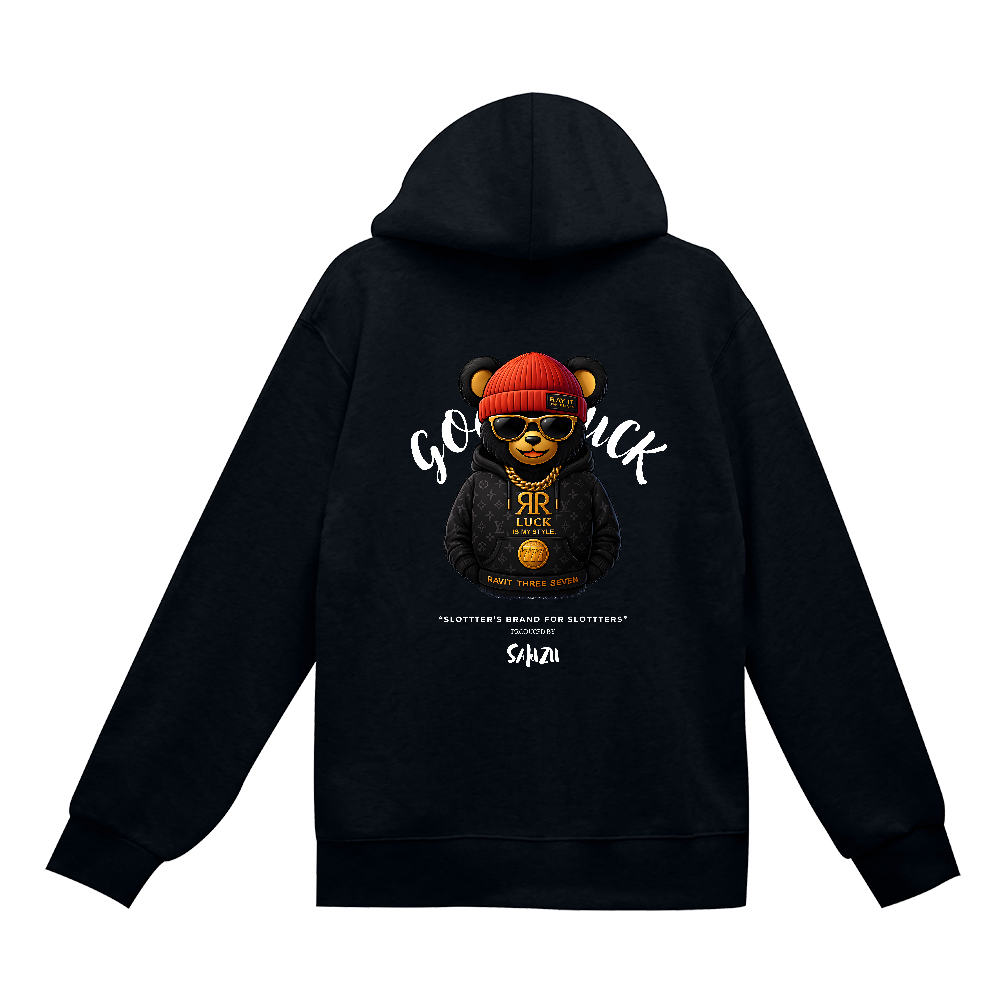 RAVIT THREE SEVEN を象徴する ゴージャスベア を背面に大きく配し、前面左胸にはブランドの世界観を象徴する ROUTE777 ロゴ をワンポイントで配置したストリート&プレミアム仕様のジップパーカーが登場。