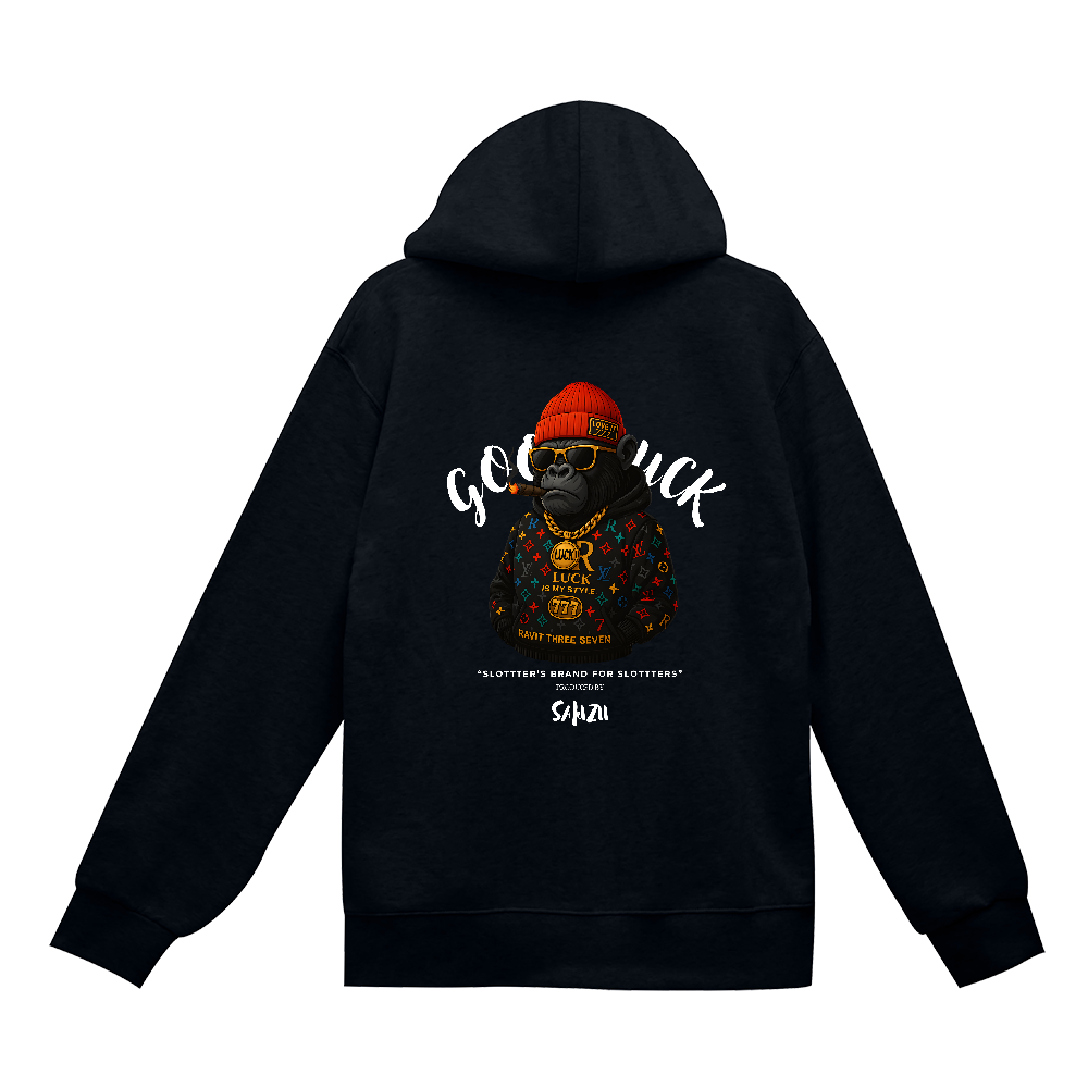 RAVIT THREE SEVEN を象徴する ゴージャスゴリラ を背面に大きく配し、前面左胸にはブランドの世界観を象徴する ROUTE777 ロゴ をワンポイントで配置したストリート&プレミアム仕様のジップパーカーが登場。