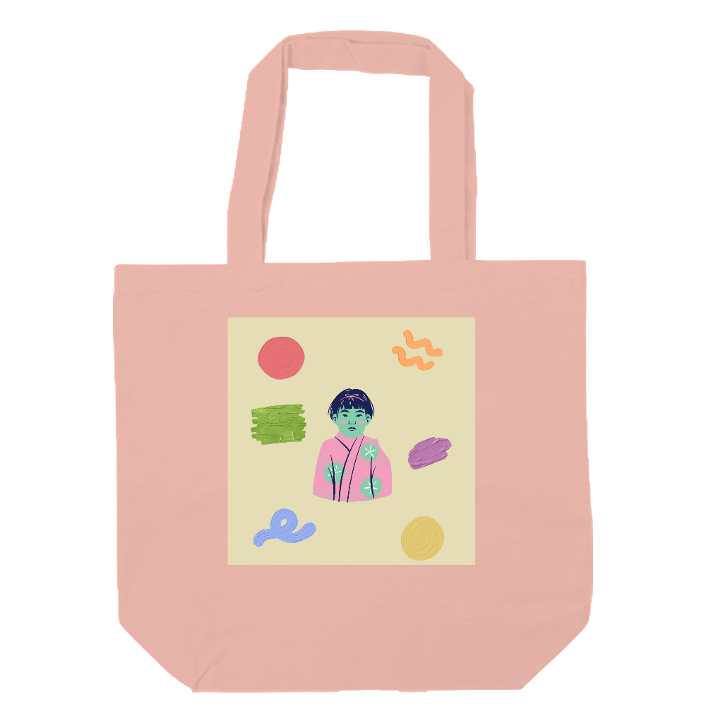 着物を着たシュールな女の子のまわりに絵の具を散りばめた、遊び心あふれるトートバッグ。