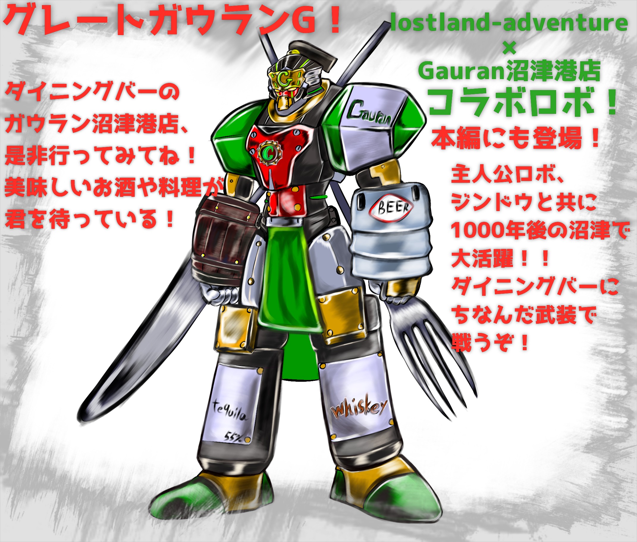 実際に沼津にあるお店、カフェ&ダイニングバー・ガウランさんとのコラボにより実現したロボ、グレートガウランGが登場!