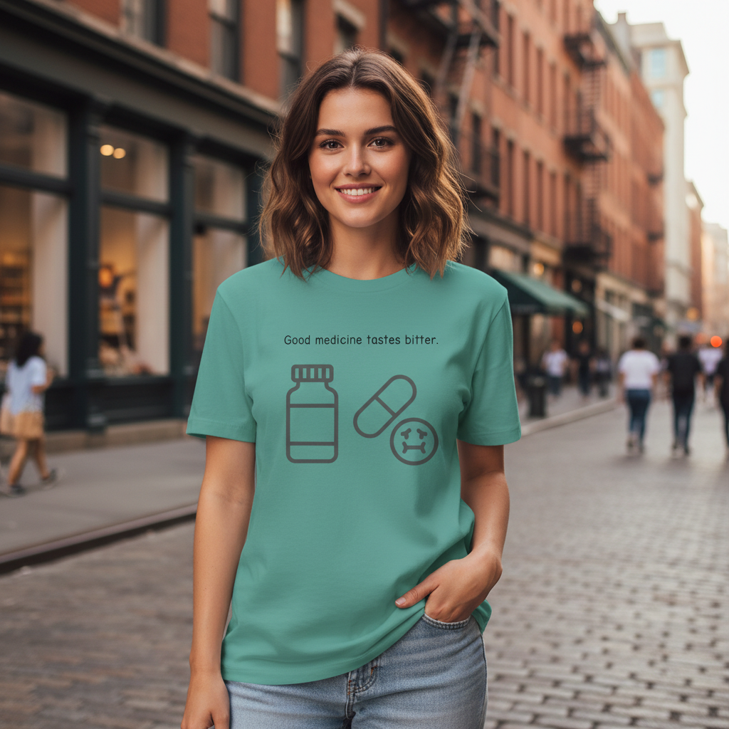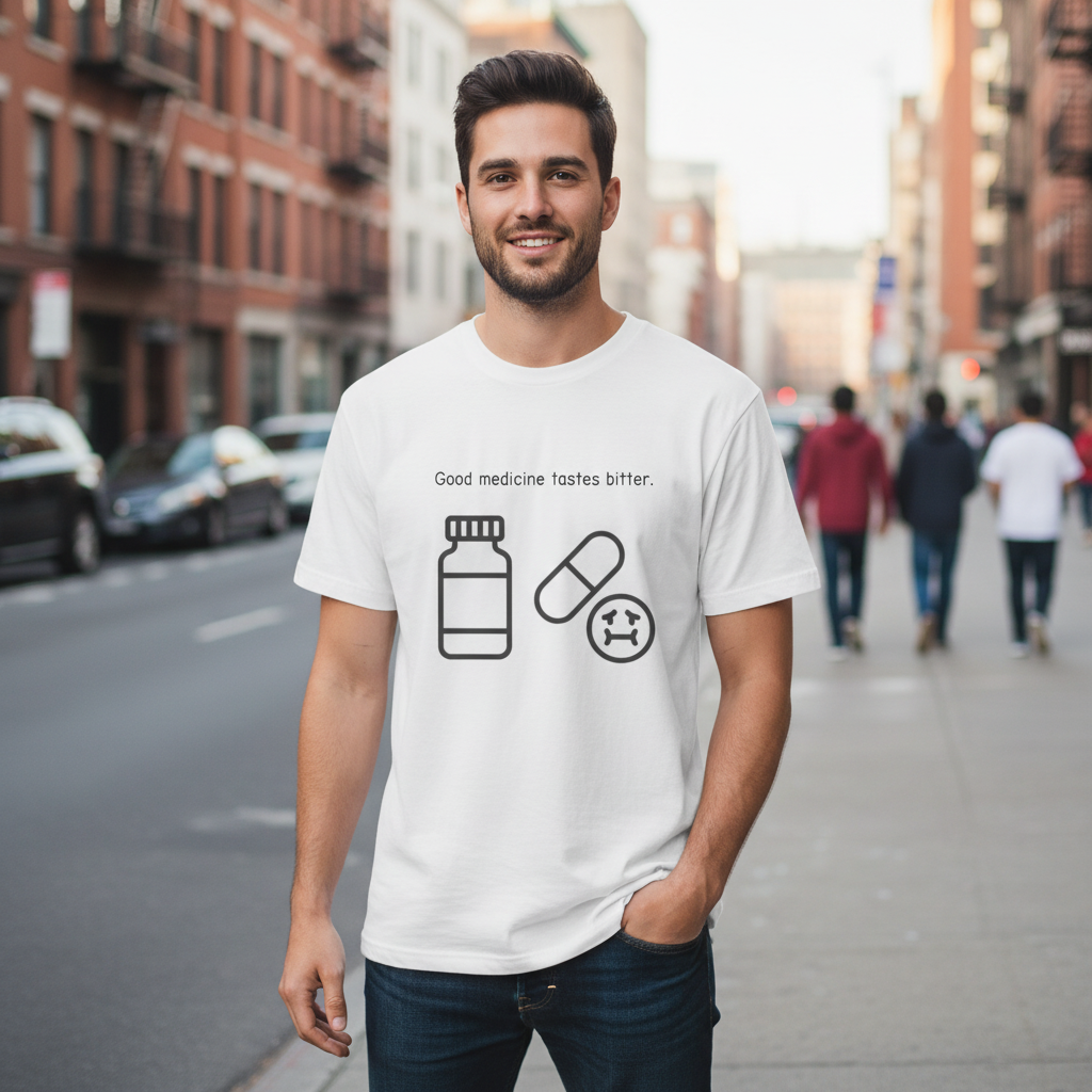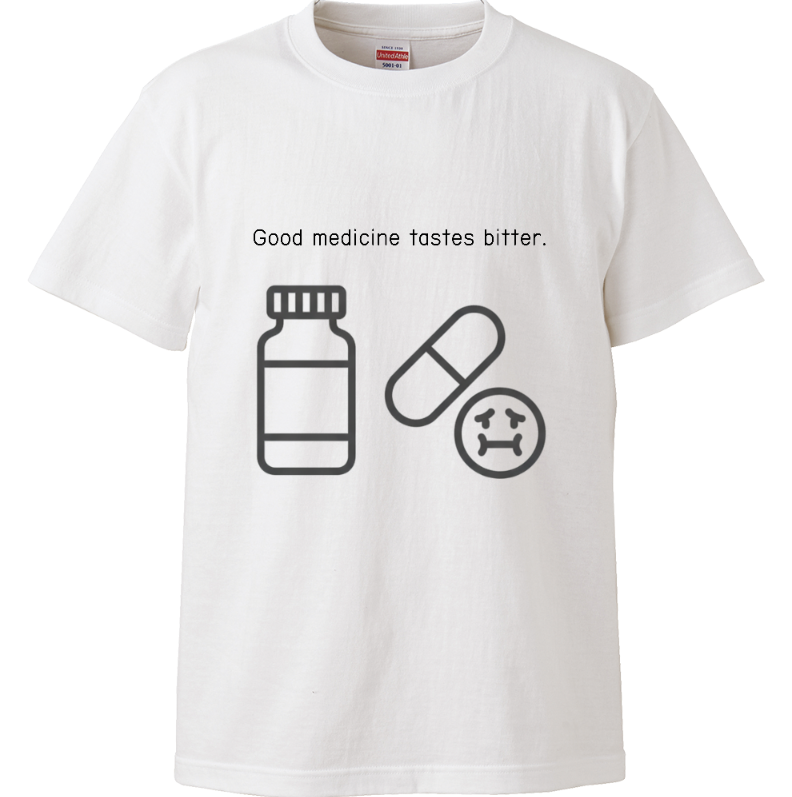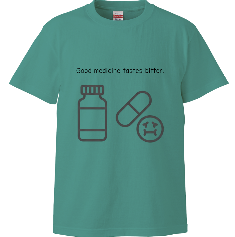 「良薬は口に苦し(Good medicine tastes bitter. )」をシンプルにデザインしました。「良薬は口に苦し」は"自分のためになる忠告は聞き入れにくいこと"を意味することわざです。本当にそうですよね。自分のためになる言葉こそ受け入れにくいものですよね。