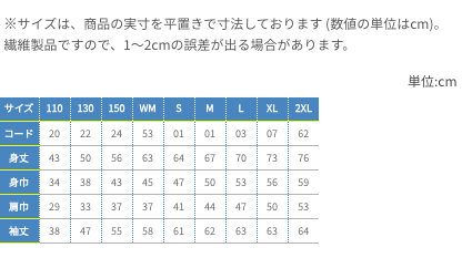 | 単位:cm | 110 | 130 | 150 | WM | S | M | L | XL | 2XL |