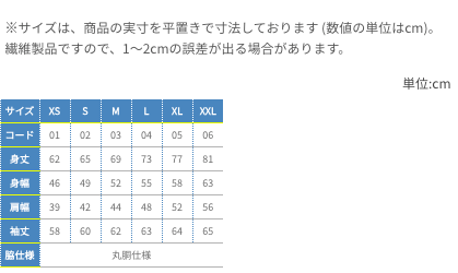 | 単位:cm | XS | S | M | L | XL | XXL |