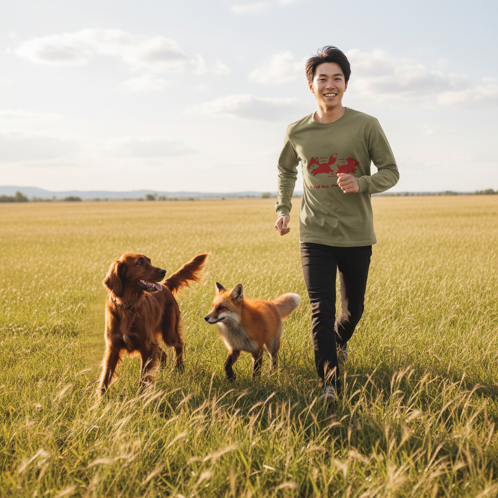 [ロングTシャツ] A red dog chases a fox.