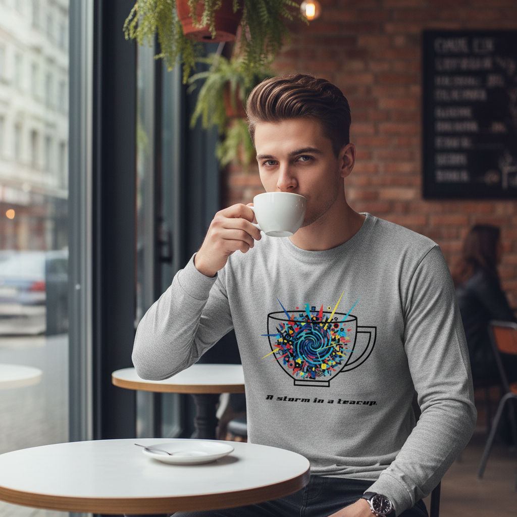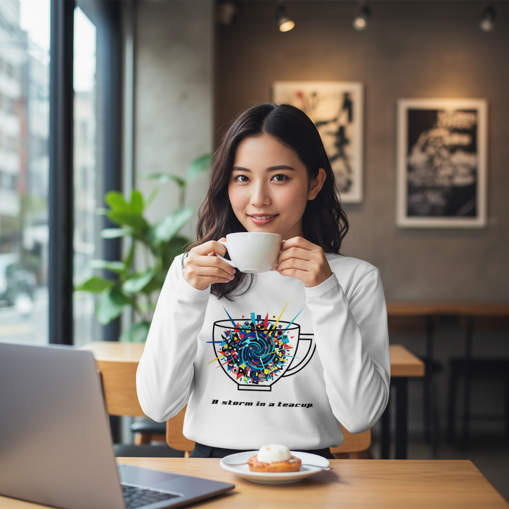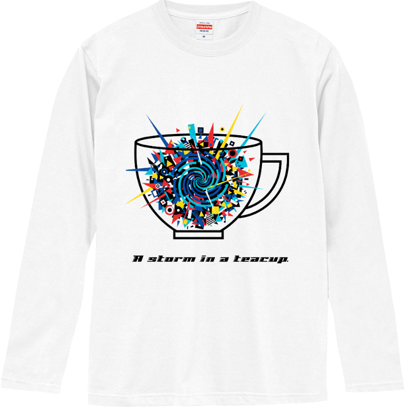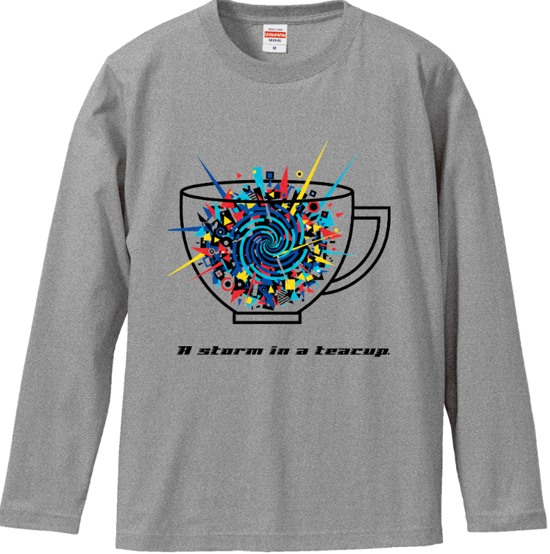 「コップの中の嵐(A storm in a teacup)」を現代アート風にデザインしました。「コップの中の嵐」とは"大局には影響しない小さなこと"を意味することわざです。大局には影響しなくても本人にとっては大変なこともありますよね。