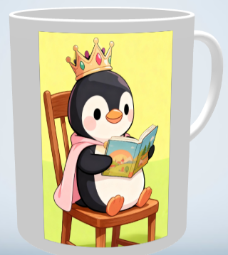 椅子にちょこんと座り、絵本を読むぺんぎんさん。