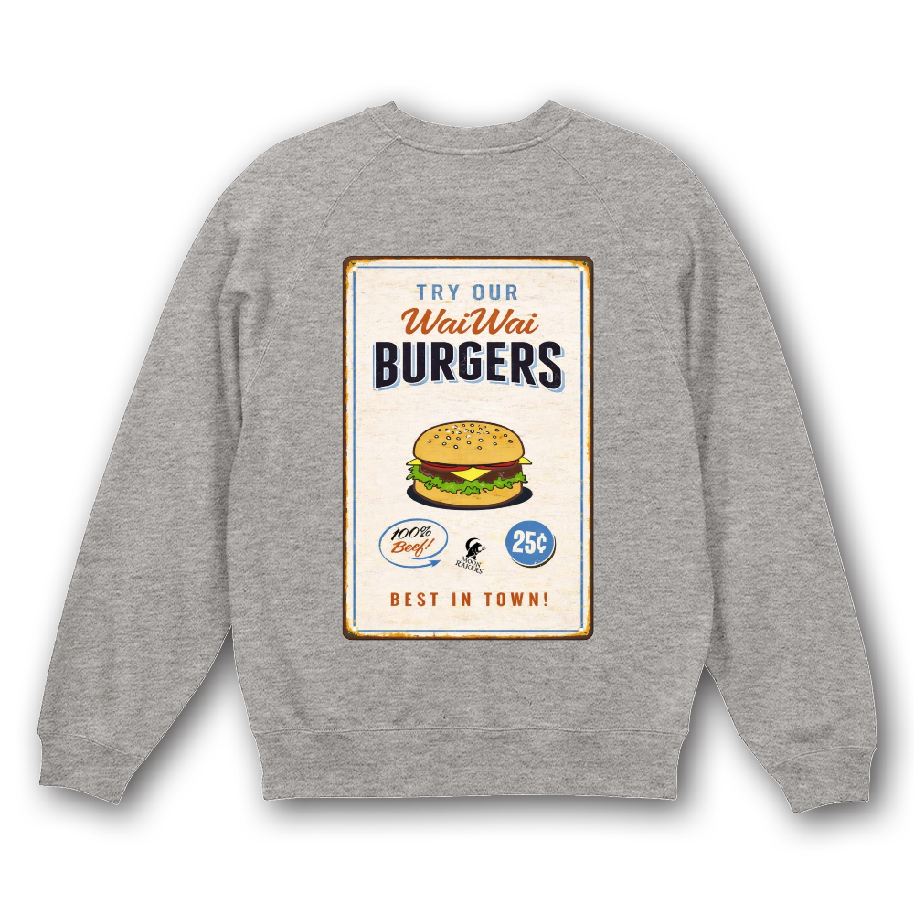 ハンバーガーショップ風デザインを背面にプリントしたラグランスリーブのスウェットシャツです