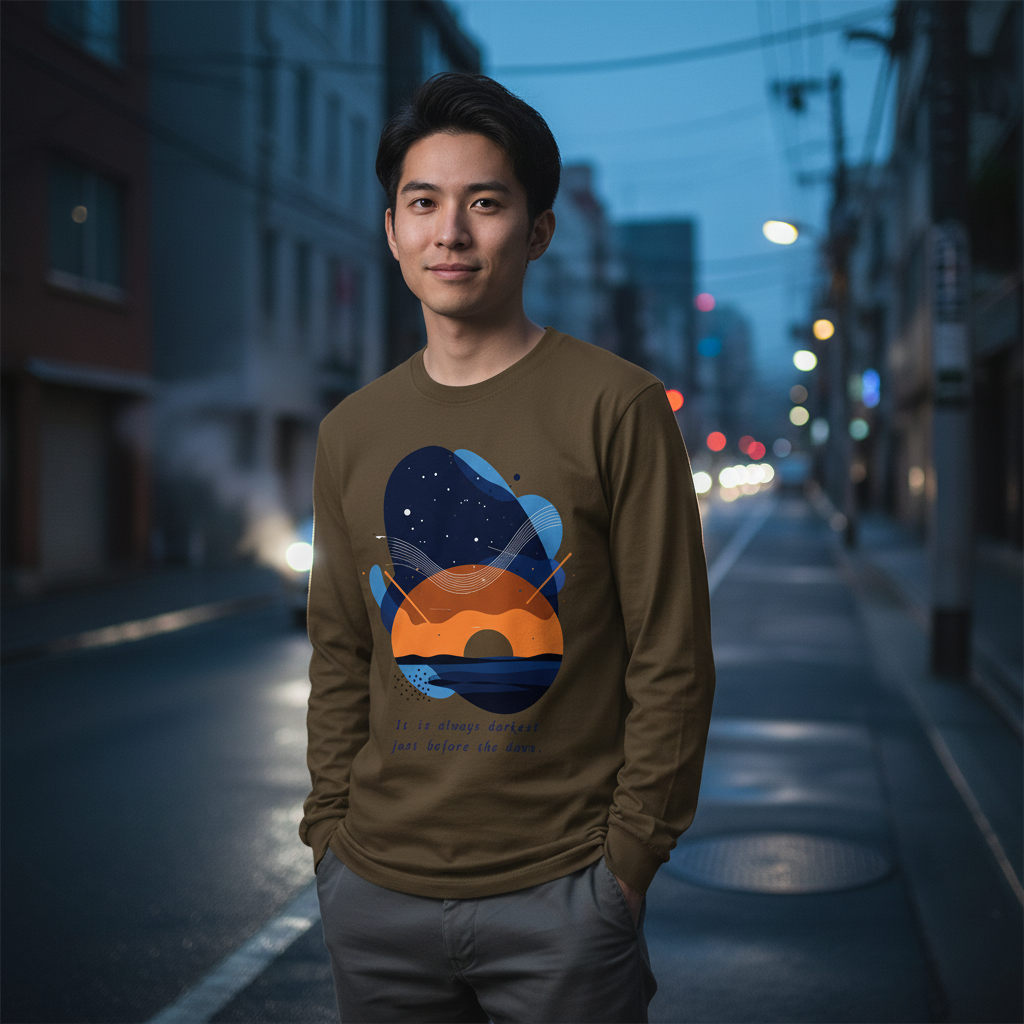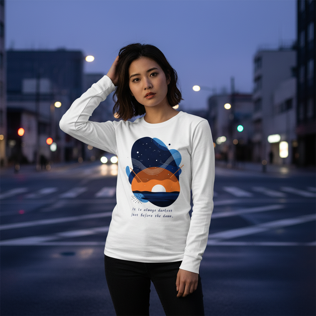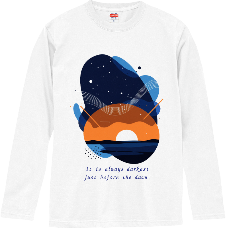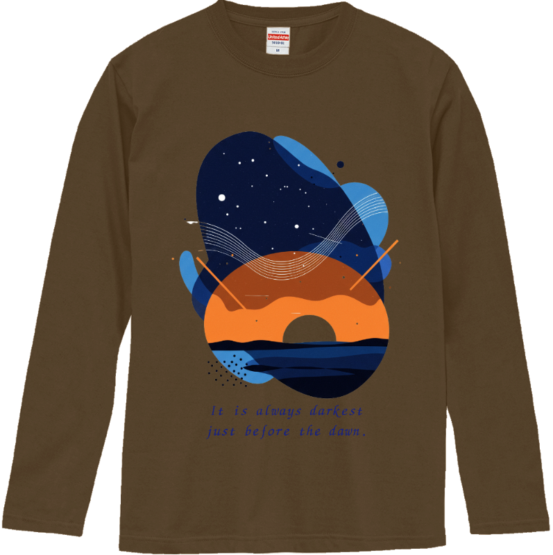 「夜明け前が一番暗い(It is always darkest just before the dawn)」をデザインしました。「夜明け前が一番暗い」は"苦難の先には明るい未来が待っている"ことを意味することわざです。何事にも大変な時期はありますが、何とか乗り越えたいものですね。