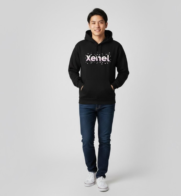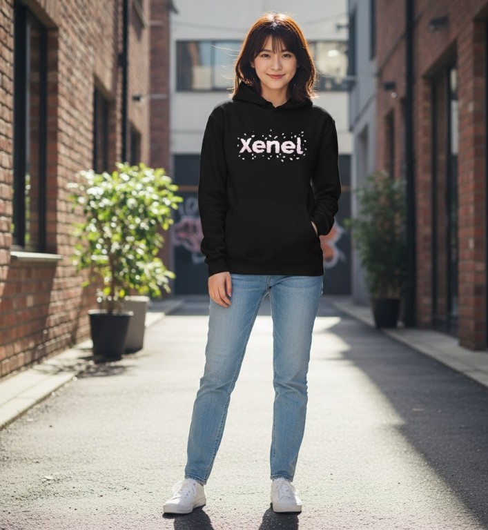 胸元に浮かぶのは、花びらで描かれた Xenel のロゴ。