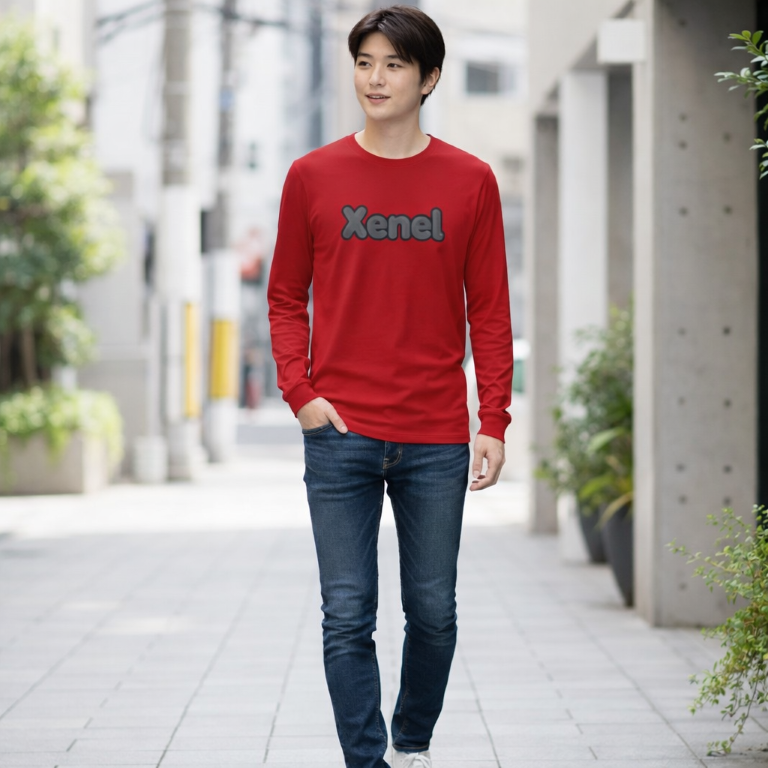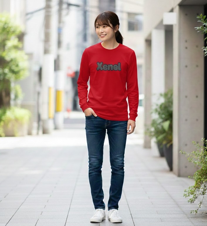 鮮烈なレッドに浮かび上がるXenelロゴが、視線を一瞬で奪うロングスリーブTシャツ。