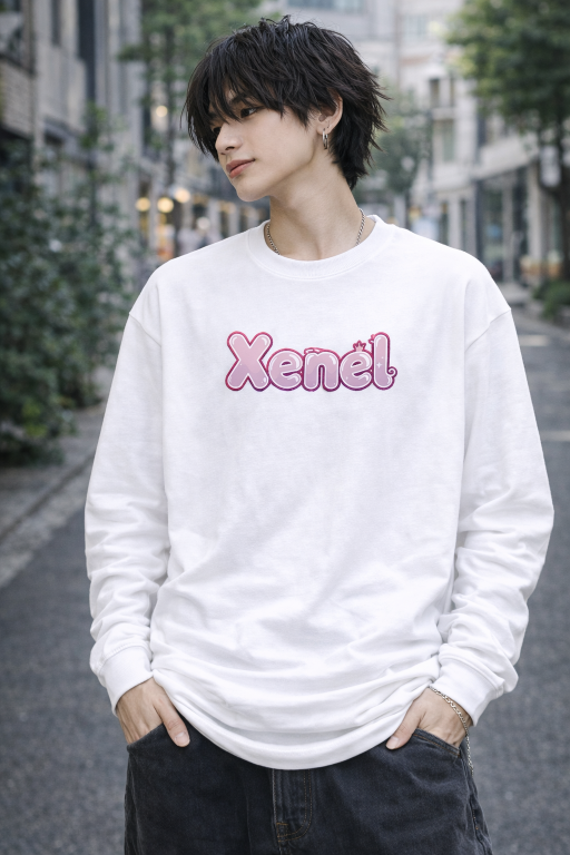 胸元のピンクの「Xenel」ロゴが、シンプルな白スウェットにさりげない可愛さをプラス。