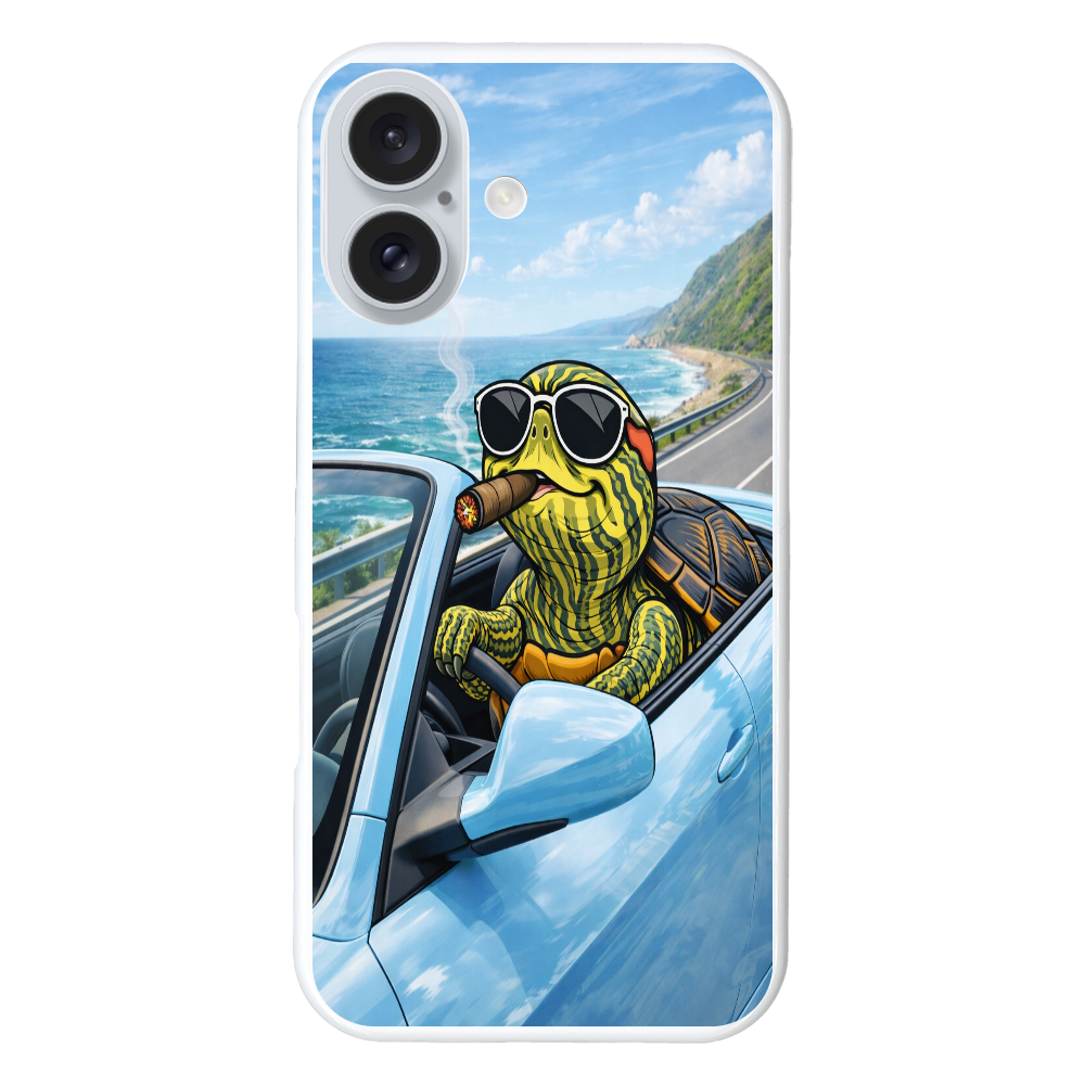 青いオープンカーで海沿いを走る、ドン・カメキチをデザインしたiPhoneケースです。