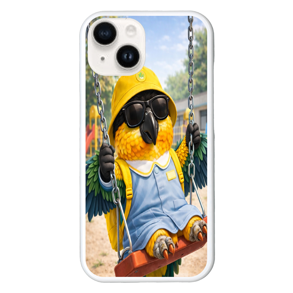 黄色い帽子と園児服を身にまとったドン・ムックが、公園のブランコでのんびり過ごす姿をデザインしたスマホケースです。