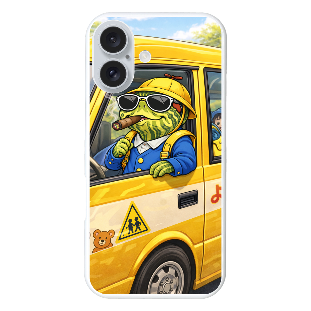 黄色い園児バスに乗り、サングラス姿でドンと構えるミドリガメ「ドン・カメキチ」をデザインしたスマホケースです。