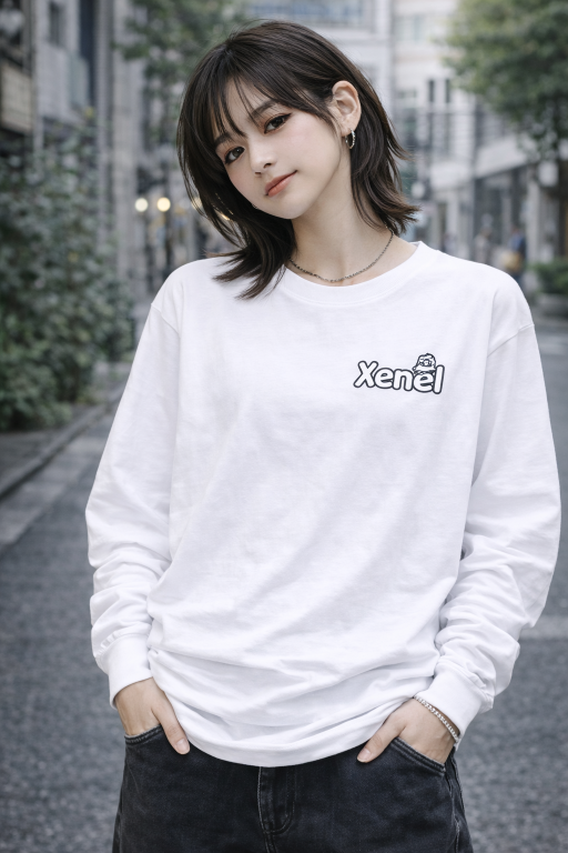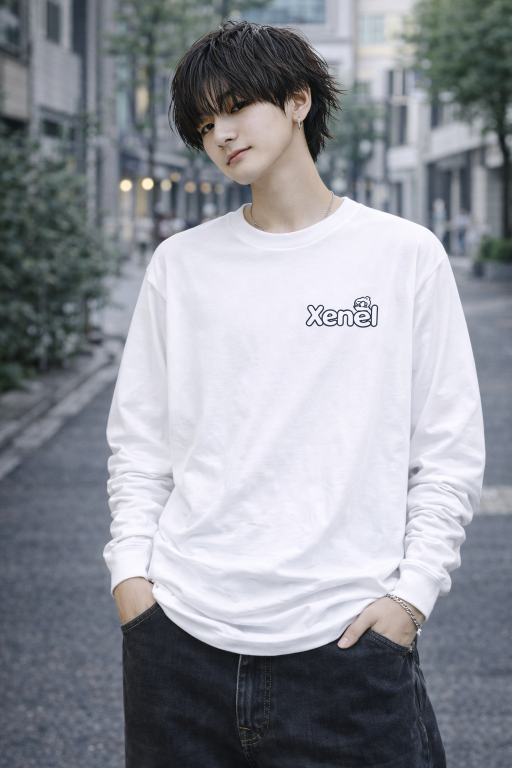 胸元に小さく配置された「Xenel」のミニロゴが印象的な、ワンポイントの長袖Tシャツ。