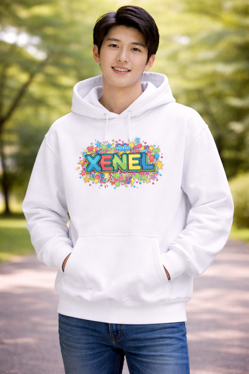 カラフルなモチーフが弾けるように広がる、遊び心あふれるXenelのロゴフーディ。