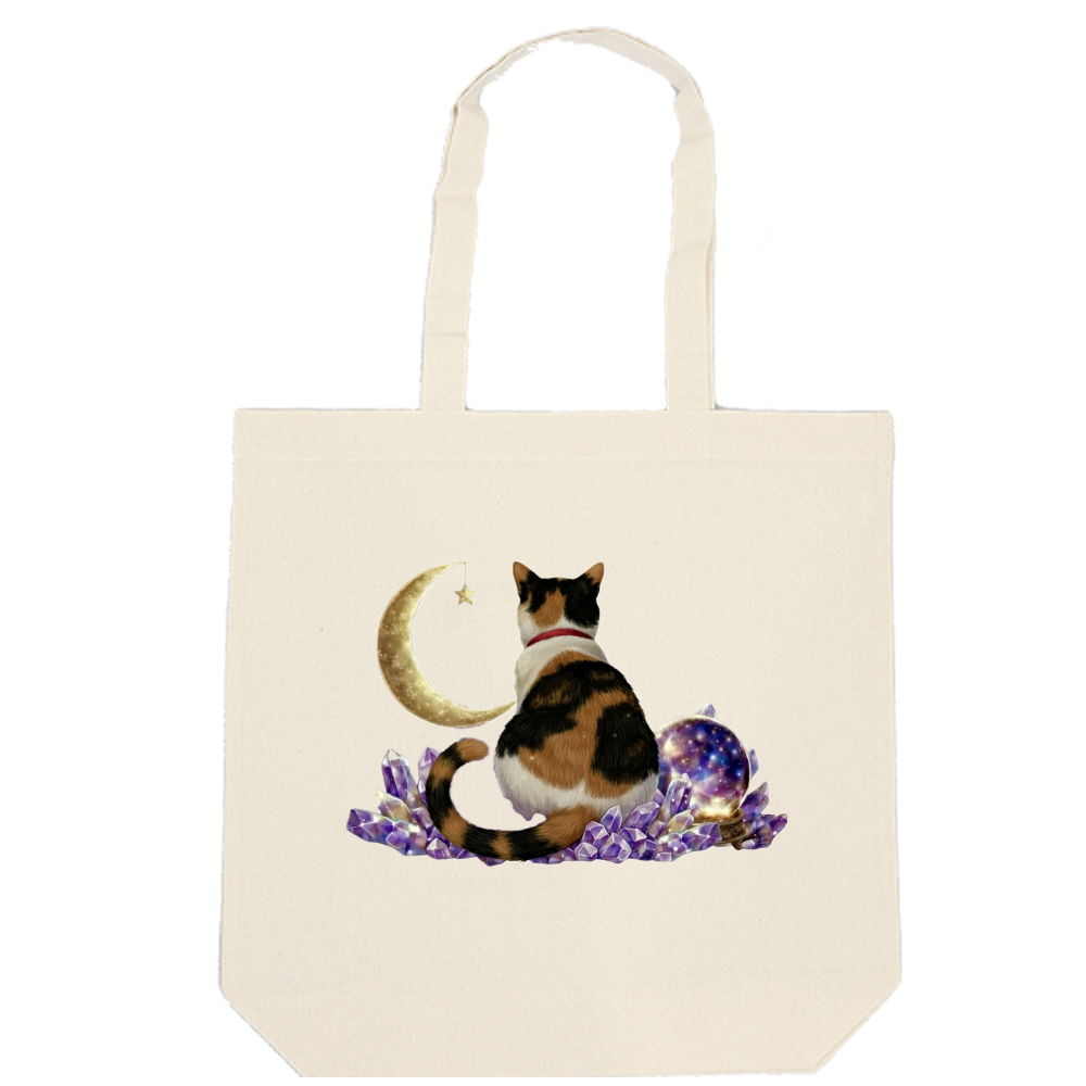 宇宙猫スプをモチーフにした幻想的なデザインのトートバッグ。日常使いしやすいサイズ感で、普段のお出かけやお仕事バッグとして活躍します。