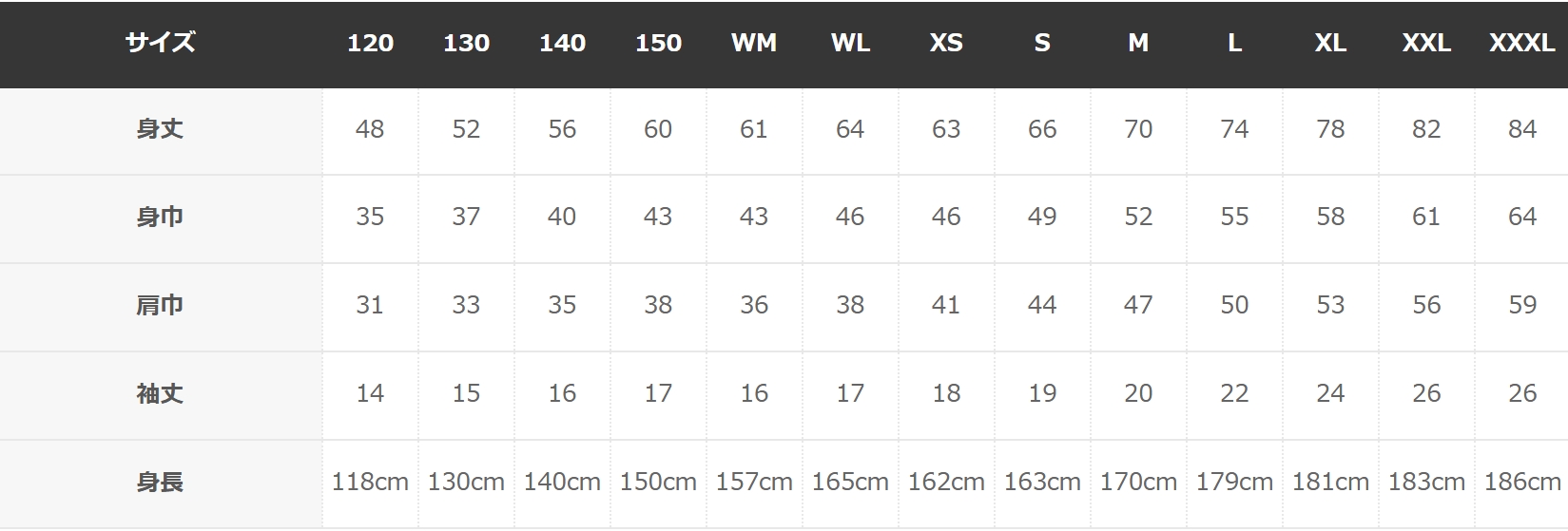 | 単位:cm | 120 | 130 | 140 | 150 | 160 | WM | WL | S | M | L | XL | XXL | XXXL |