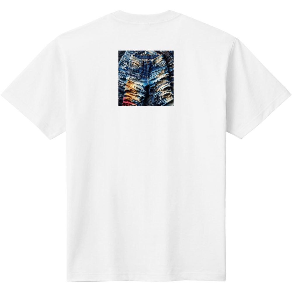 アバンギャルドなデザインとフォルムのダメージデニムをTシャツにインサートした、どこにもない、差別化間違いなしのアイテムです。