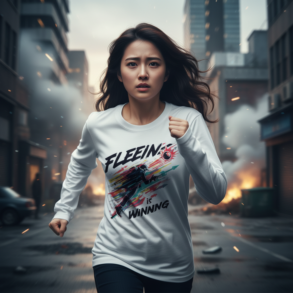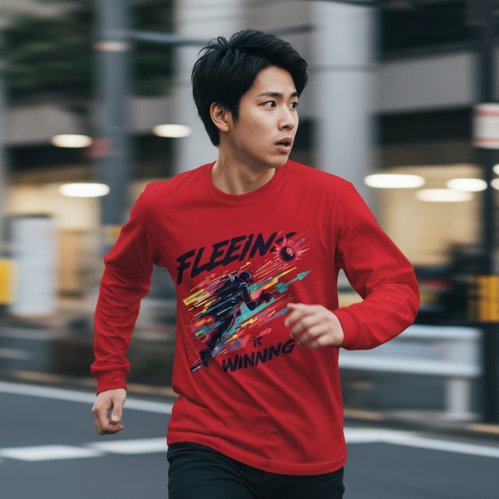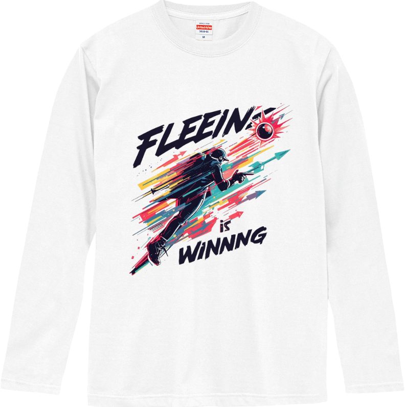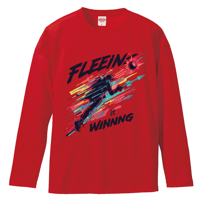 「逃げるが勝ち(Fleeing is winning.)」をデザインしました。「逃げるが勝ち」は"戦いから逃げるのは卑怯なようでも大局的には勝利をおさめることになること"を意味することわざです。状況を見極めることがなによりも重要ですね。