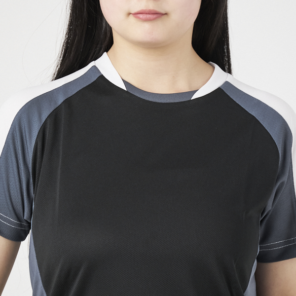 デザイン衿とラグラン切替デザインでスポーティに仕上げたTシャツです。吸汗速乾ポリ100%、ソフトな風合いの上質な素材を採用しています。ラグラン袖と伸縮性のあるウーリー糸で動きやすくなっています。