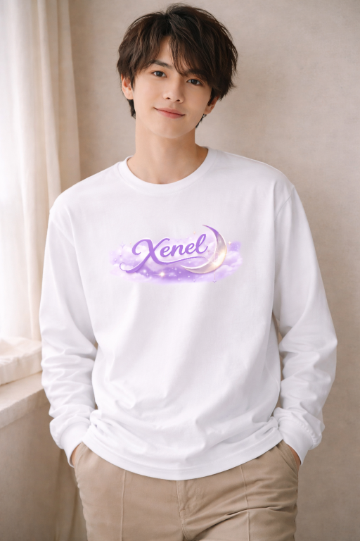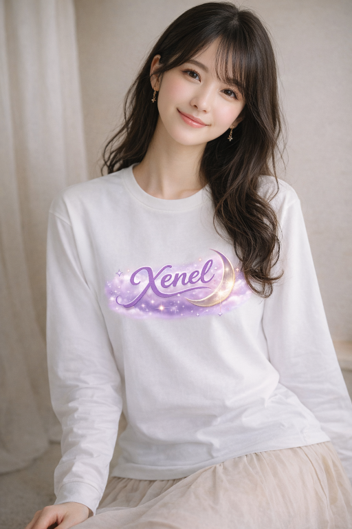 やわらかなラベンダーカラーで描かれた「Xenel」ロゴが、幻想的な雰囲気を演出するロングスリーブTシャツ。