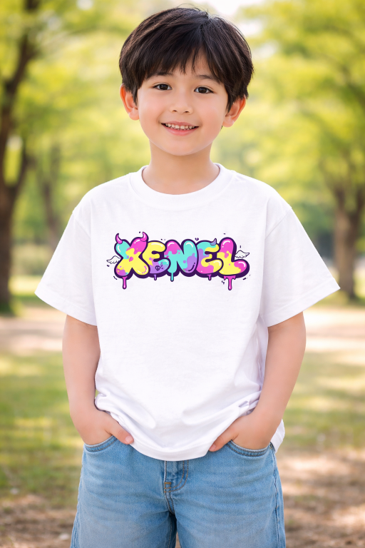 ポップなドリップロゴにツノとウィングをプラスした、ストリート感あふれるキッズTシャツ。