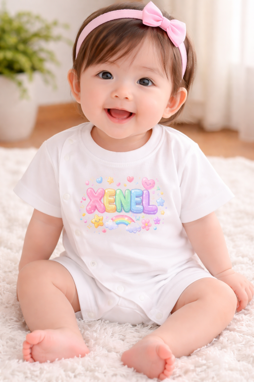 ぷっくりパステルロゴに、虹や星、ハートを散りばめたドリーミーなベビーロンパース。