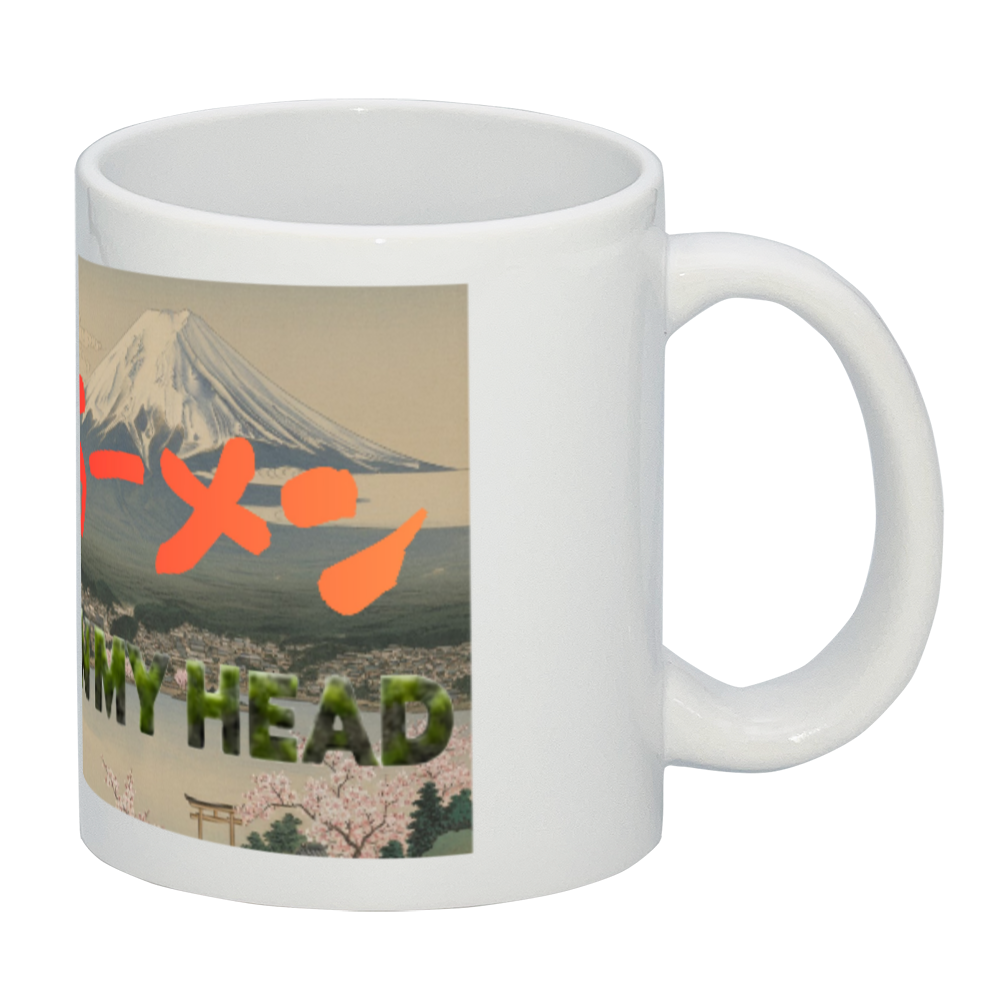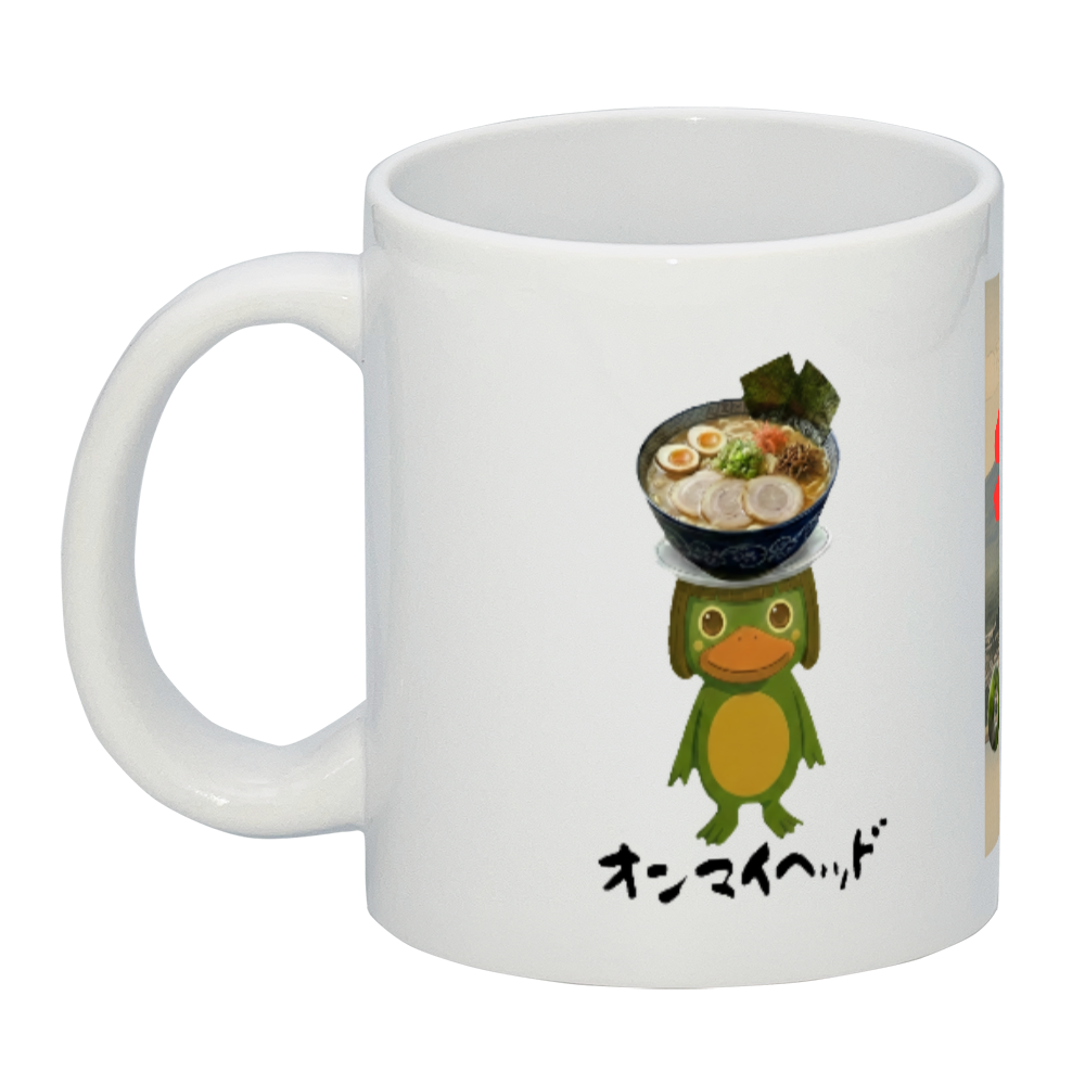 Our original "On My Head" series is now a high-quality mug! It features a surreal and humorous illustration of the Japanese folklore monster "Kappa" balancing a delicious bowl of ramen.