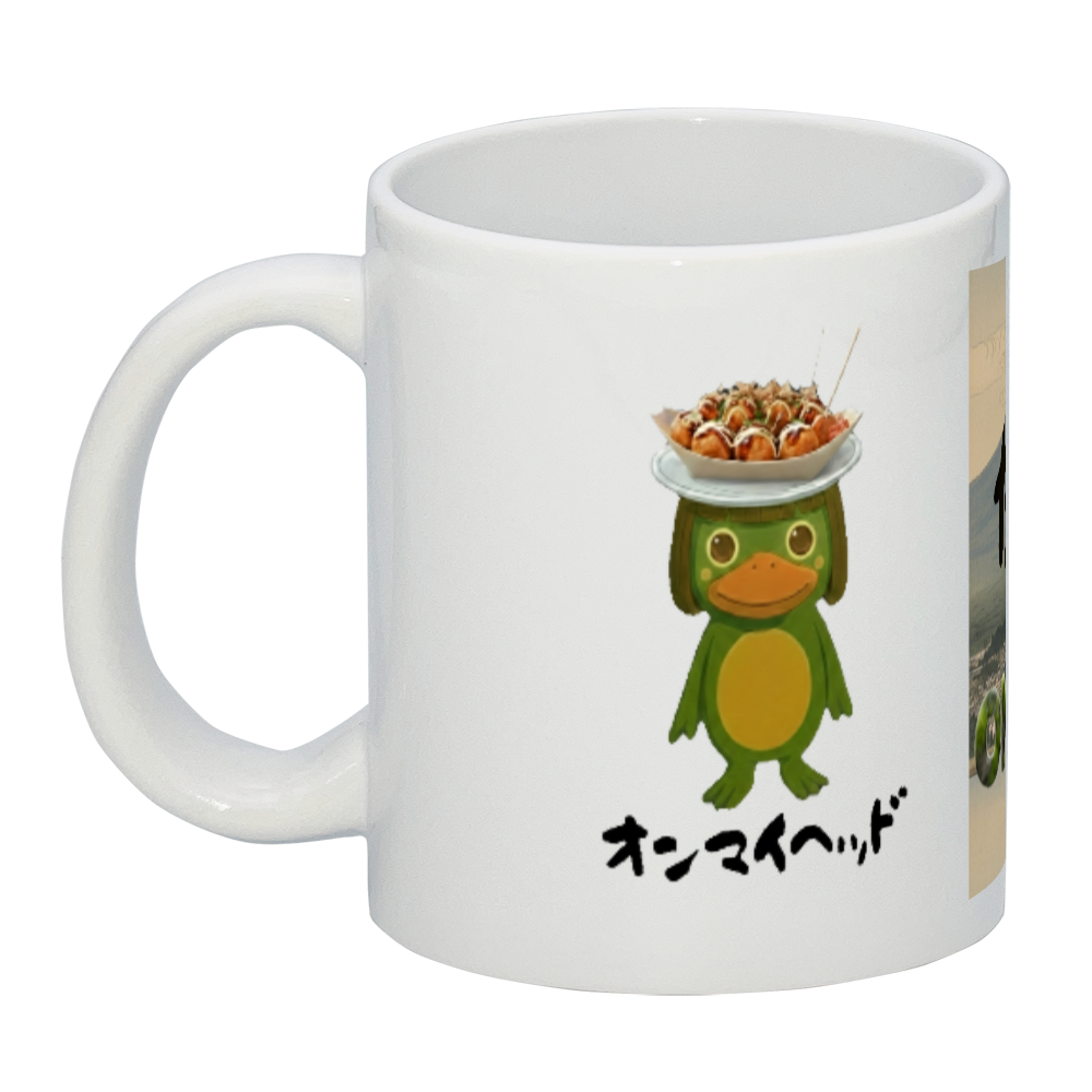 Our popular "On My Head" series is now a fun and functional mug! It features a surreal and cute illustration of "Kappa" balancing a tray of steaming hot Takoyaki (Octopus Balls) on his head.