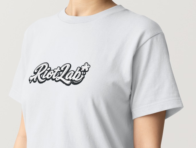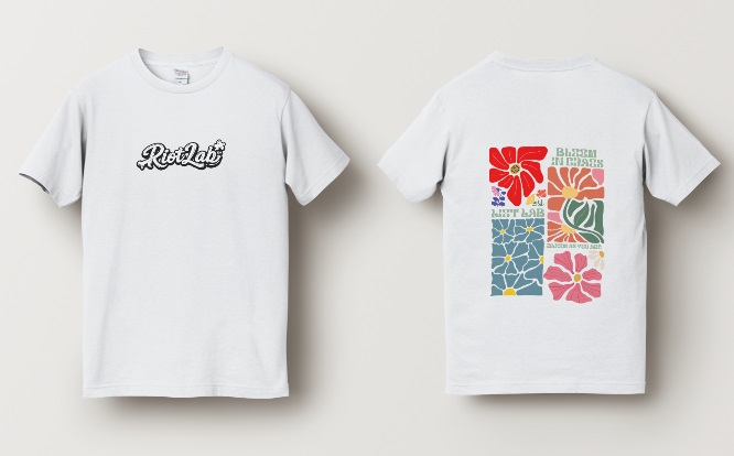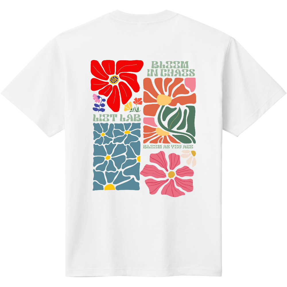 色とりどりの花をパネルアートのように配置した、RiotLabオリジナルグラフィックTシャツ。