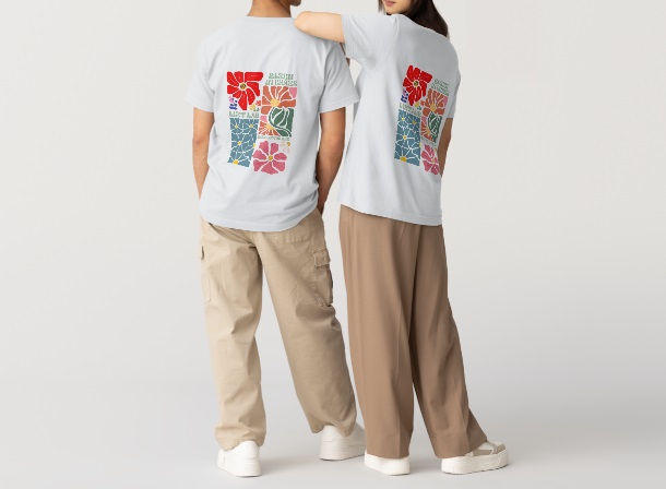 1枚からフルカラーで手軽にプリント。アパレル風の自然な風合いになります
