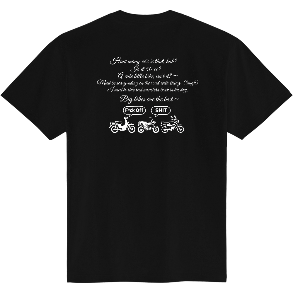 バックプリントには、大排気量至上主義な人たちが使いがちな「お決まりのセリフ」を皮肉たっぷりに並べ、その下には元気に走るカブやダックス、モンキーたちの姿を描きました。