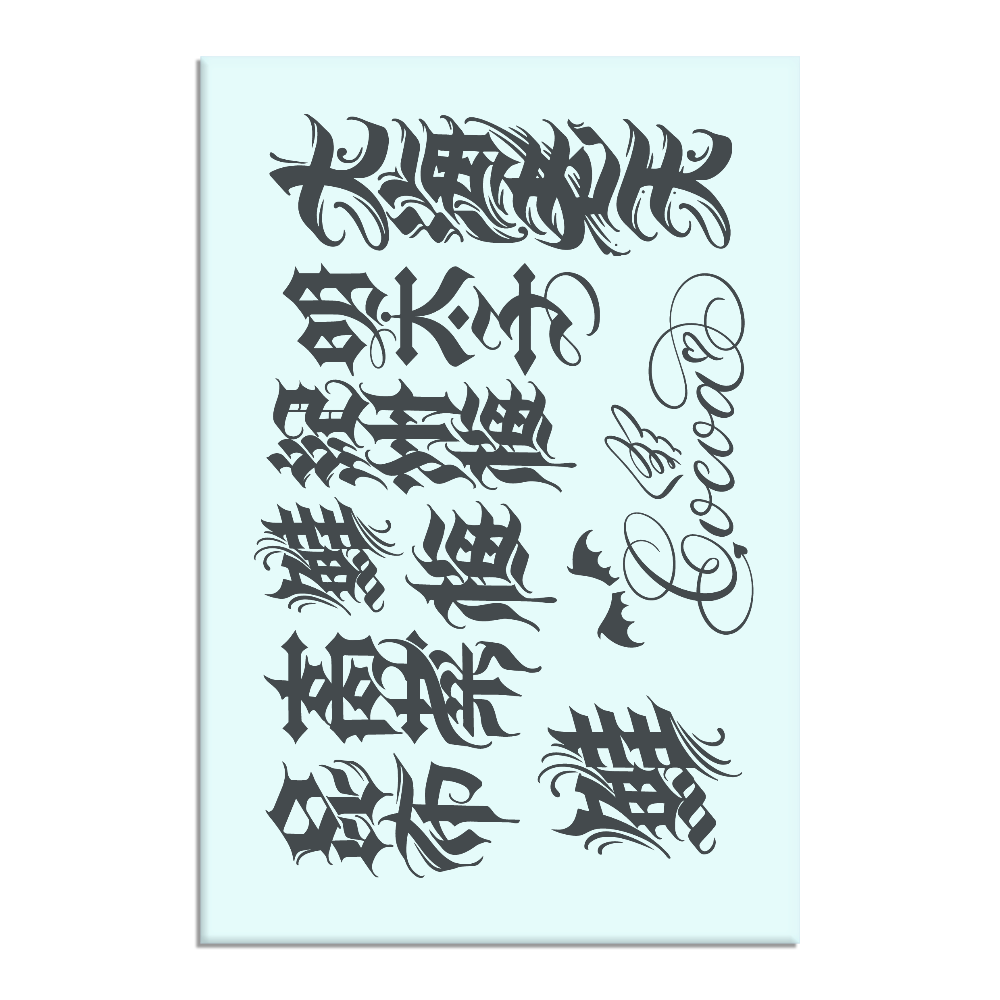 おにぎりの具材を漢字カリグラフィーに落とし込んだインパクトあるステッカータイプのタトゥーシールです。気軽に貼り替えができるのでデイリーユーズにお楽しみください。