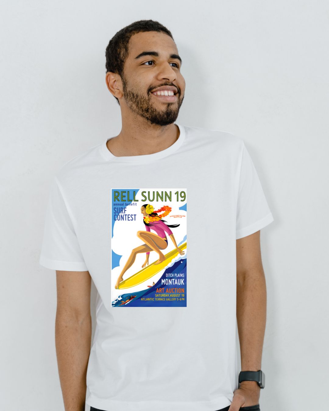 クラシックなサーフコンテストポスターをモチーフにした、ヴィンテージ感あふれるアートTシャツです。