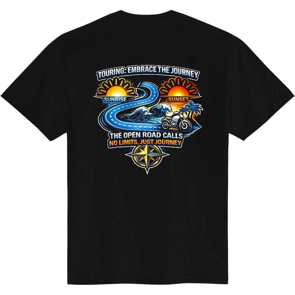 かつて風を切って走ったあの爽快感、そして終わりのない道への憧れを形にした一着です。フロントにはシンプルかつ力強く「THE OPEN ROAD CALLS」のメッセージとコンパスを配置。バックには、地平線から昇る太陽と沈む夕陽、そして波打ち際を駆け抜けるライダーの姿をダイナミックに描きました。