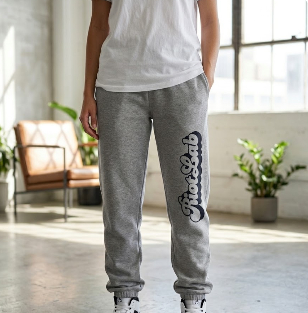 ストリート感あふれるバブルロゴが目を引く、RIOTLABオリジナルスウェットパンツ。