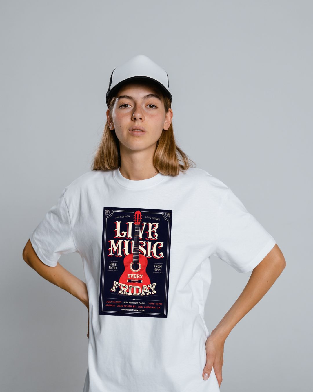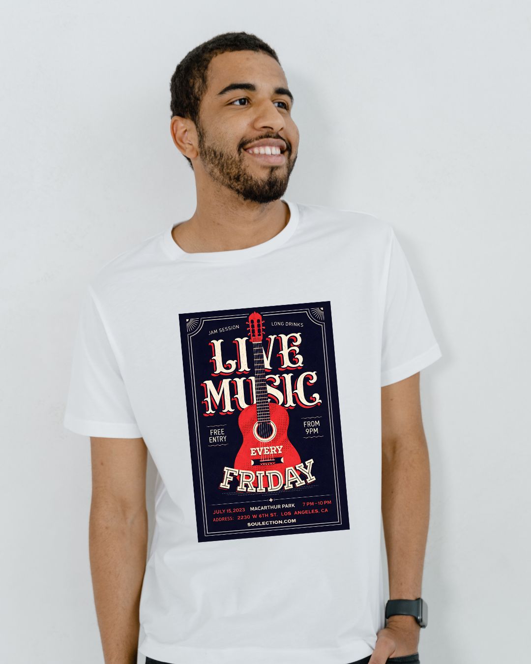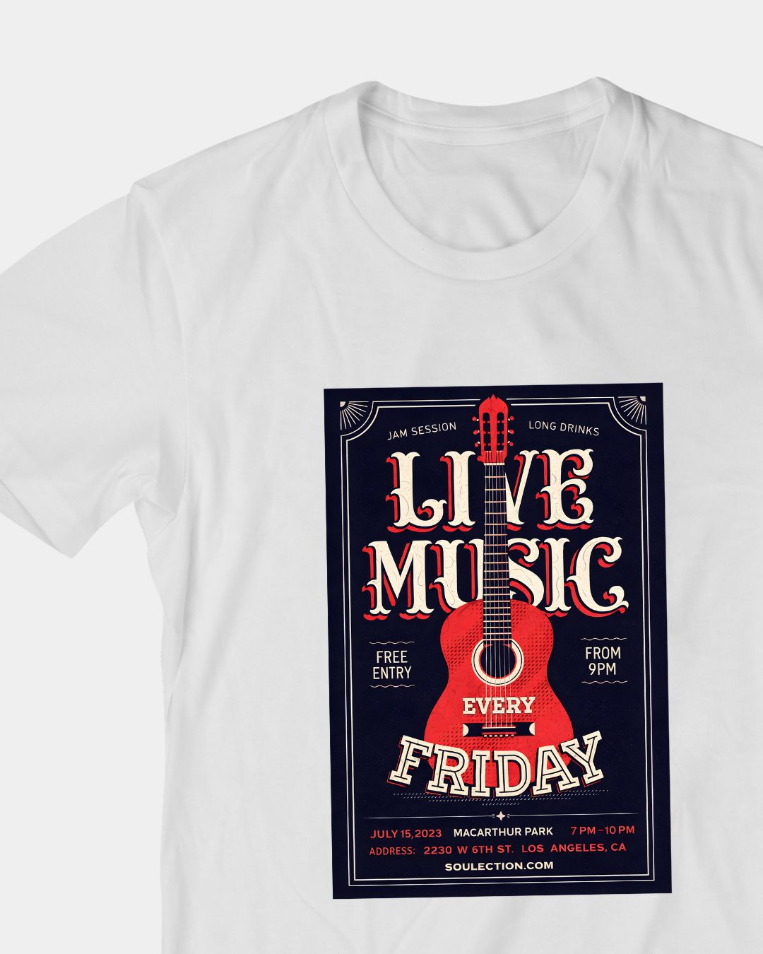 ライブミュージック レプリカ Tシャツ|ギター ポスター グラフィック|ジャムセッション フライデー|ヴィンテージ 音楽デザイン