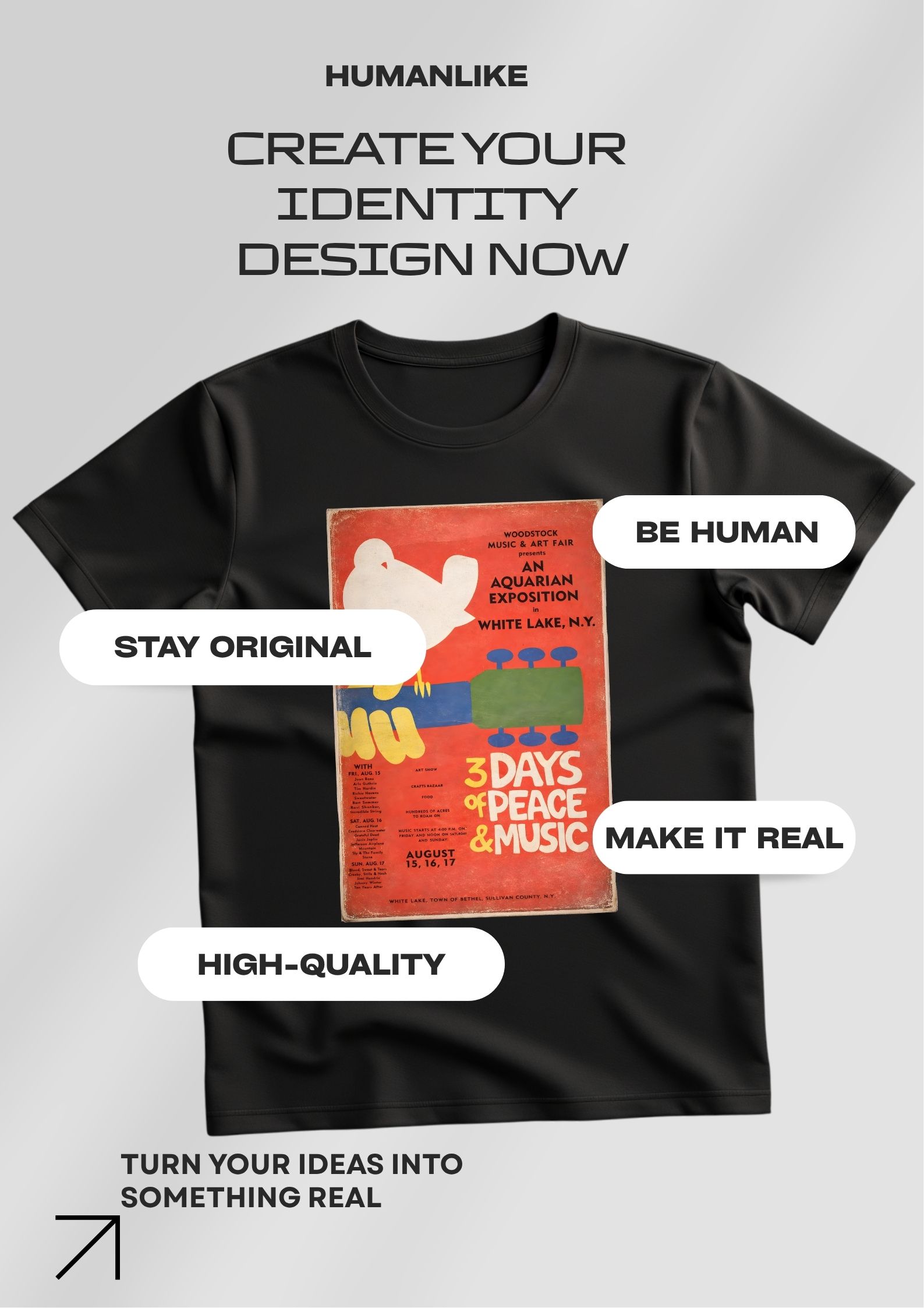 1969年、伝説の音楽フェス「WOODSTOCK」をモチーフにしたヴィンテージポスター風デザイン。