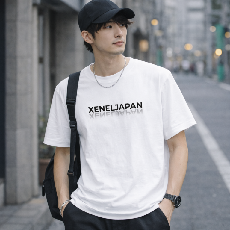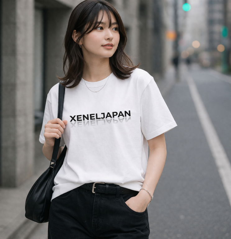 「XENEL JAPAN」のロゴを反転させたミラーデザインが、静かなインパクトを生み出す一枚。