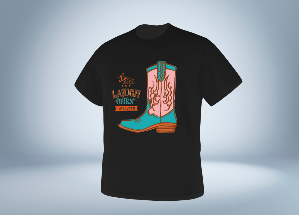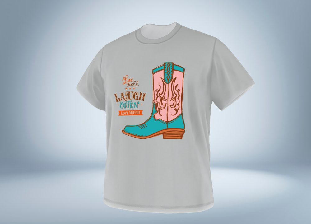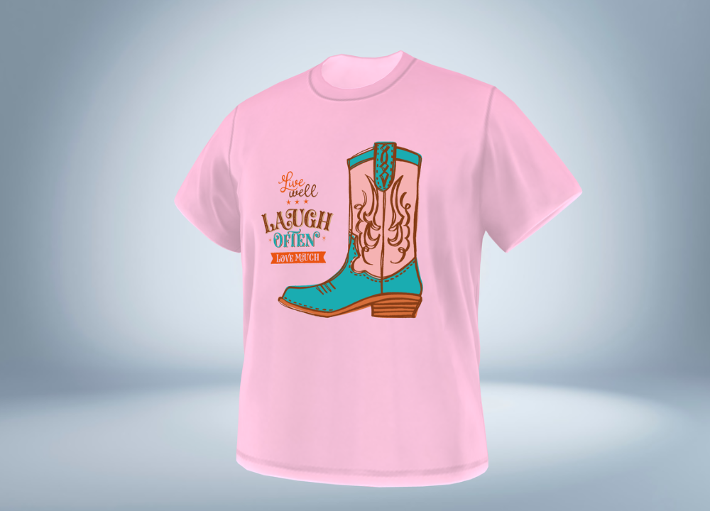 【デザイン】手描きの線で描いたウエスタンブーツイラストに、キュートなカラーをデジタルで着彩しました。英文 “Live well, Laugh often, Love much”は、manaT-繪処のスローガンで、“健やかに生き、よく笑い、こよなく愛す”という意味です。