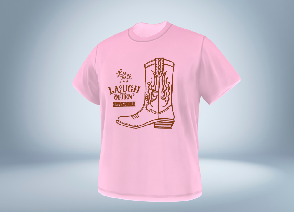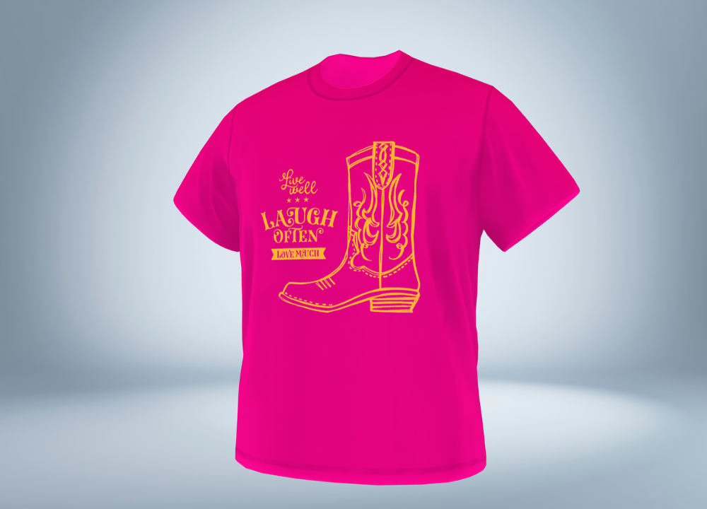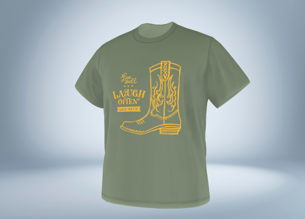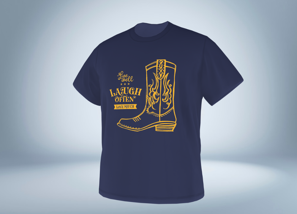 【デザイン】手描きの線のみでシンプルに表現したウエスタンブーツのイラストを黄色に変換。英文 “Live well, Laugh often, Love much”は、manaT-繪処のスローガンで、“健やかに生き、よく笑い、こよなく愛す”という意味です。