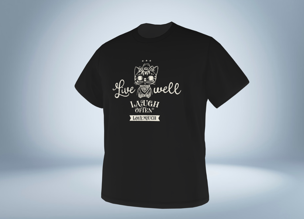 【デザイン】手描きの線のみでシンプルに表現したウエスタンスタイルの猫イラスト。英文 “Live well, Laugh often, Love much”は、manaT-繪処のスローガンで、“健やかに生き、よく笑い、こよなく愛す”という意味です。