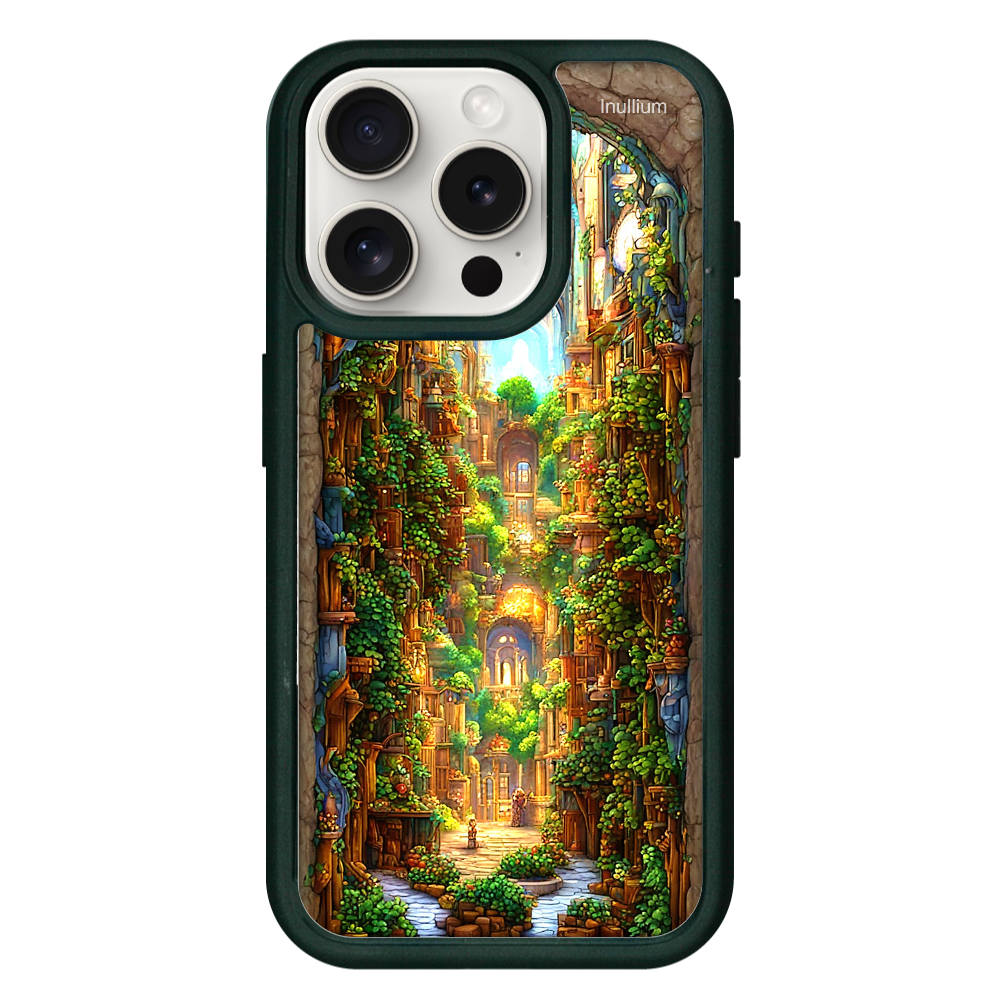 ファンタジー世界の美しい森にある街をイメージしたiPhone15 Pro用ケース。