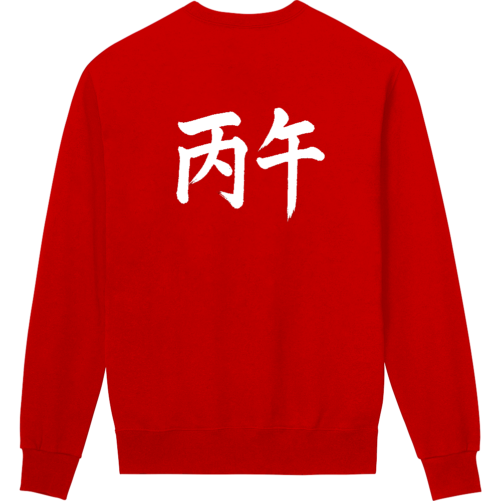 「 還暦祝いの勝負服 赤地に白字 背に毛筆体「丙午(ひのえうま)」」