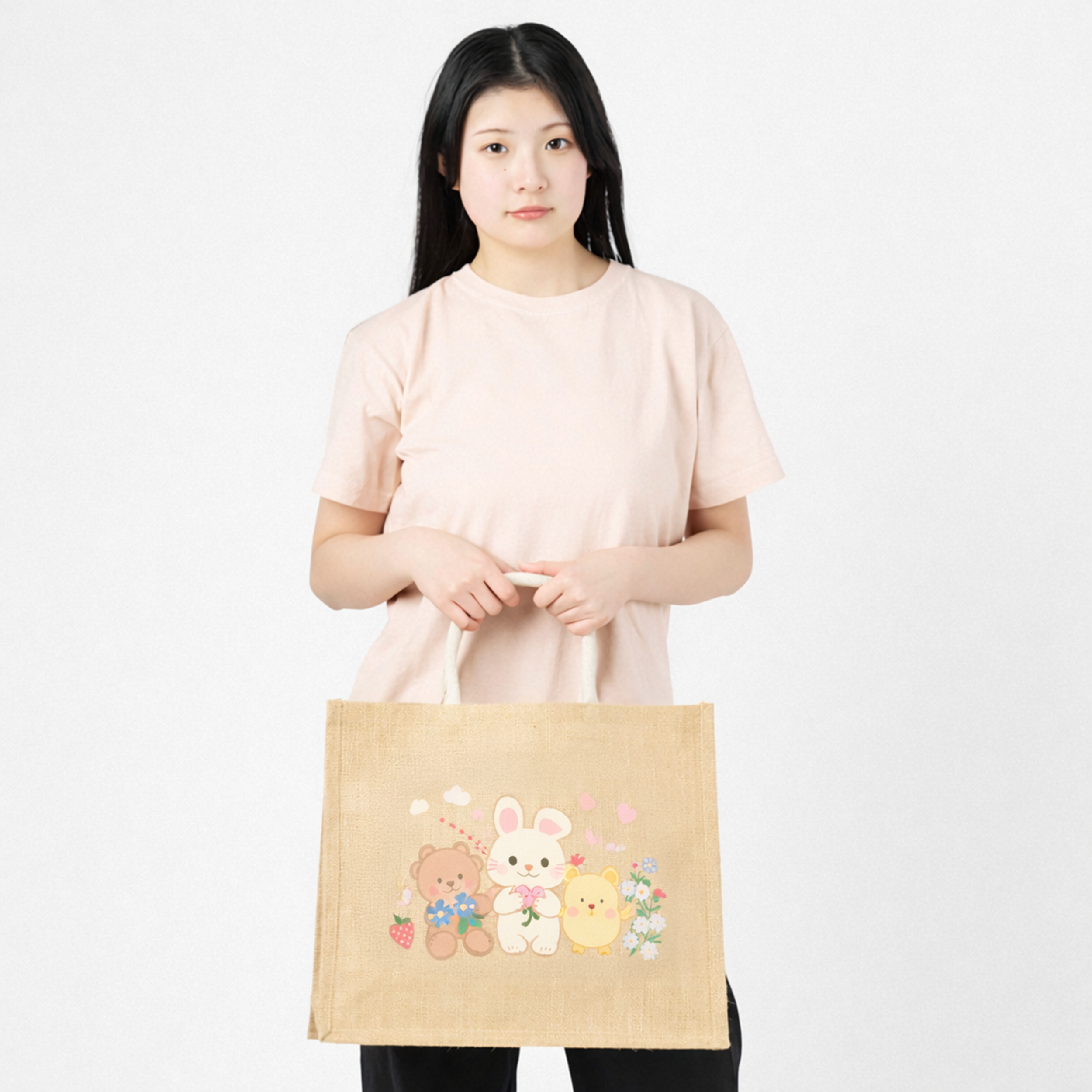 麻の一種で通気性や弾力性に優れたジュートを使用し、ざっくりとしたナチュラルな色合いがオシャレな収納能力が高い大きめのトートバッグ。お買い物やアウトドアなどの荷物が多い外出時の強い味方で、インテリアとして飾っても映える商品です。
