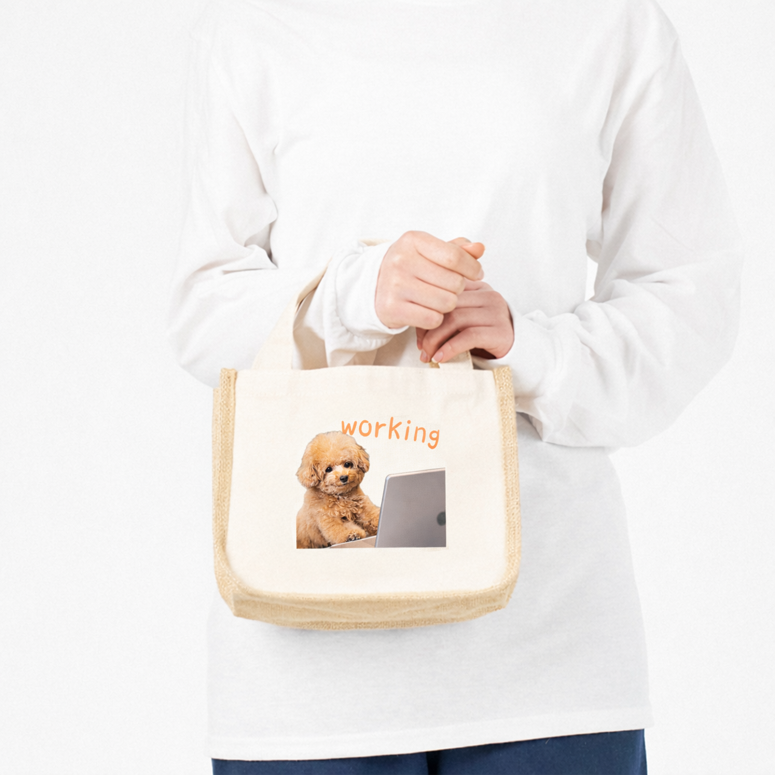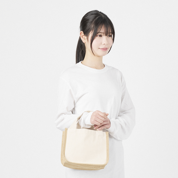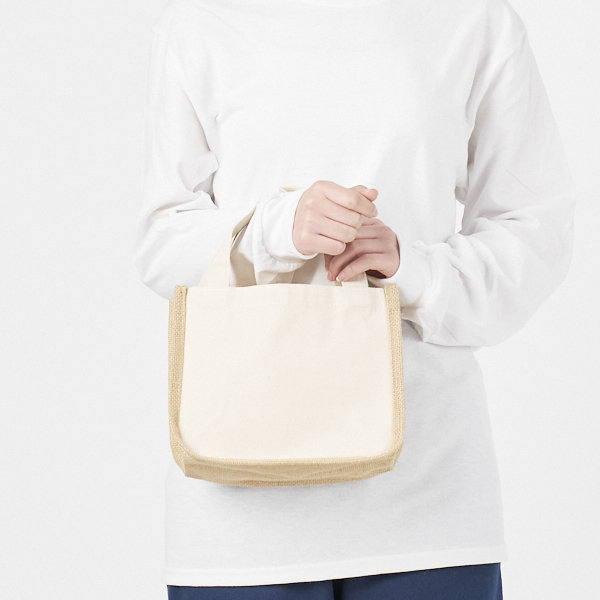 麻の一種で天然素材のジュートはざっくりとした素材感でこなれ感を演出しています。ランチトートはもちろん普段使いにもお勧めです。インテリア小物としてもお使いいただけます。